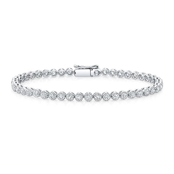 diamond tennis bracelet has a single row of diamonds sitting in a filigree setting available in yellow rose and white gold options