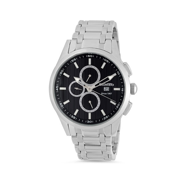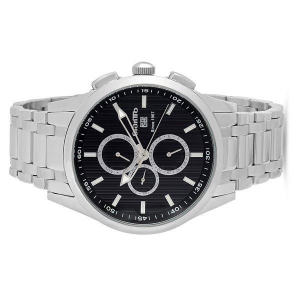 Polished Stainless steel case and bezelBlack sunray engraved vertical striped dial