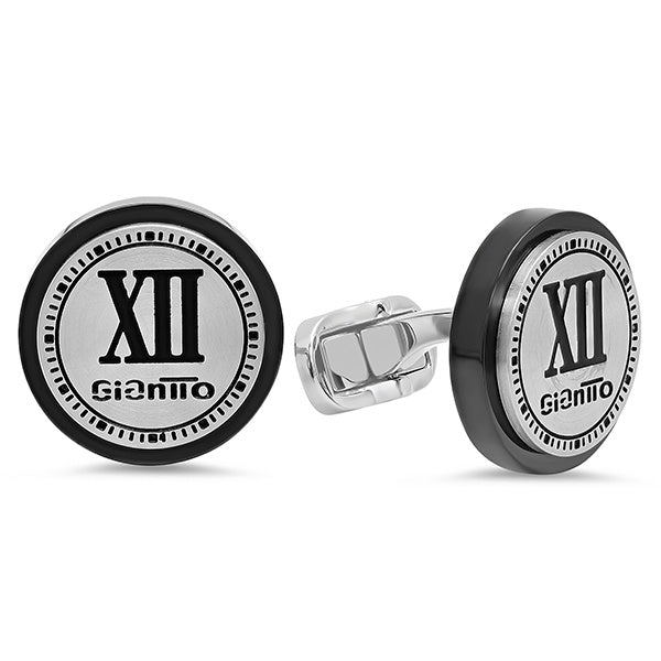 Stainless Steel and black IP matte and polished combination finish Giantto logo and Roman numeral XII etched centers engraved with tachymeter border flip toggle backing