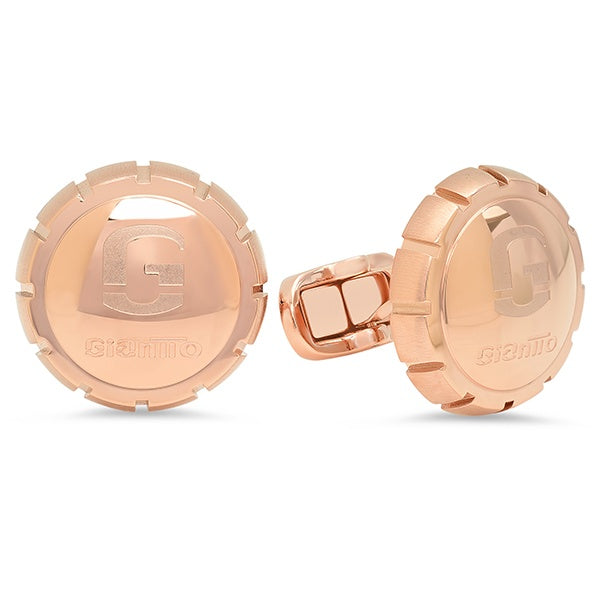 Stainless Steel Matte/polished finish rose gold IP Retrograde notched edge semi polished G logo centers engraved flip toggle backingPrimary color: Rose gold