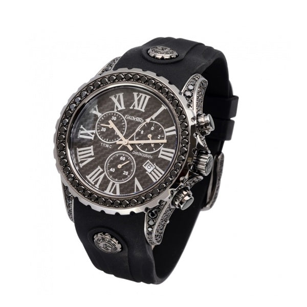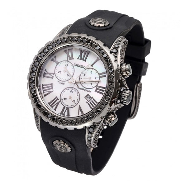 Titanic III Black mother of pearl dial Swiss ETA quartz Chronograph. Hand set black diamond bezel and Lugs with black silicone band. 46mm stainless steel case Water resistant up to 5ATM.