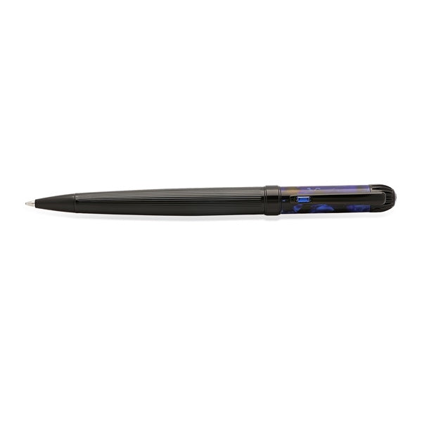 Stainless Steel repeating linear gradient high polish/ matte edge, twist rollerball Schmidt black ink with large faceted blue stone top and matching blue baguette on clip. Dark Blue Lapis pattern Acrylic detail.Ships worldwide from United States