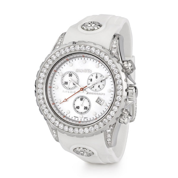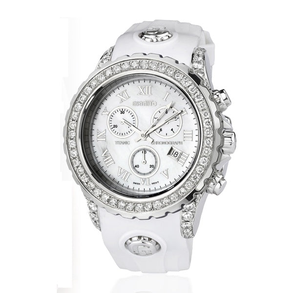 Titanic III white mother of pearl dial Swiss ETA quartz Chronograph. Hand set diamond bezel and Lugs with white silicone band. 46mm stainless steel case Water resistant up to 5ATM.Ships worldwide from United States