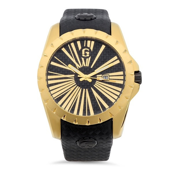 Black carbon Fiber /leather strap with signature G logo black IP buttons and stainless steel buckle.