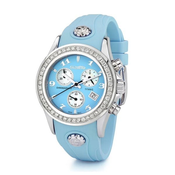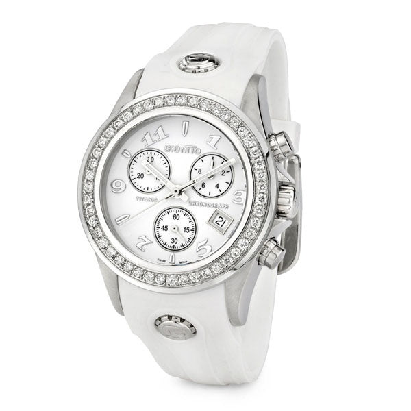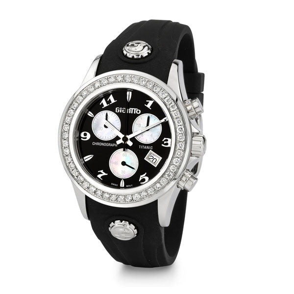 Ladies Titanic black enamel dial Swiss ETA quartz, mother of pearl chronograph with hand set diamond bezel and black silicone band. 38mm stainless steel case Water resistant up to 5ATM.