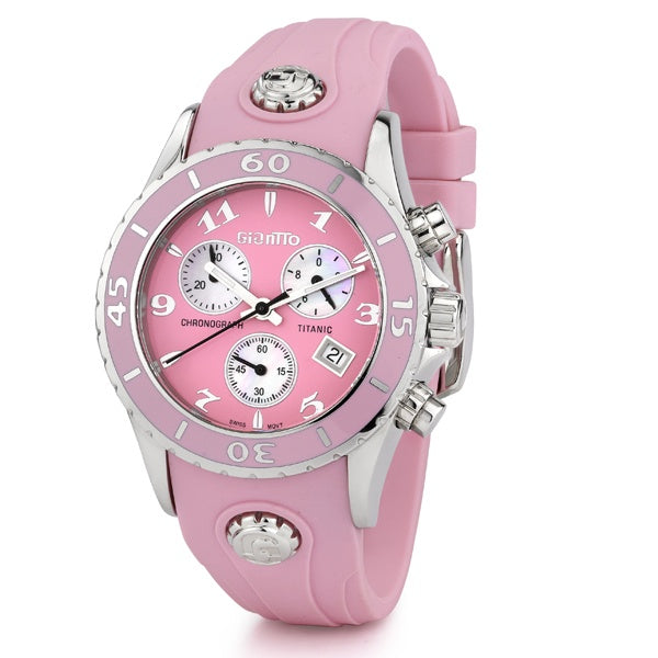 Ladies Titanic white mother of pearl Swiss ETA quartz, mother of pearl chronograph, enamel bezel and black silicone band. 38mm stainless steel case Water resistant up to 5ATM.