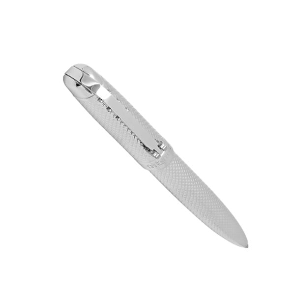 Stainless Steel polished with engraved crosshatch tube pattern, twist rollerball black Schmidt ink. Signature G logo patent wheel spinner on clip with rivets.Ships worldwide from United States