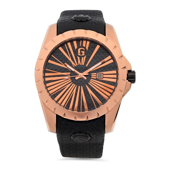 Black carbon Fiber /leather strap with signature G logo black IP buttons and stainless steel buckle.