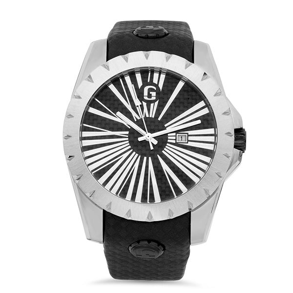 Black carbon Fiber /leather strap with signature G logo black IP buttons and stainless steel buckle.