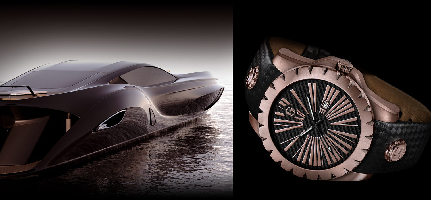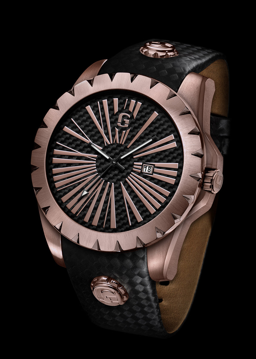 47mm Carbon Fiber dial with stretched out rose gold IP Roman numerals with date opening
