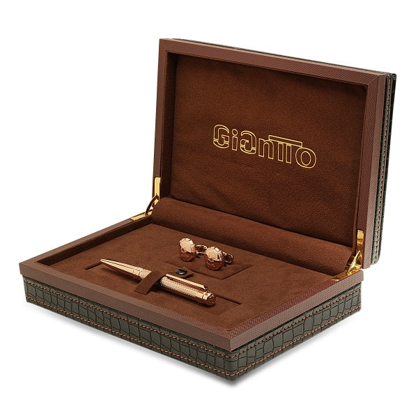 PEN: Stainless Steel polished finish rose gold IP with engraved tube pattern, twist rollerball Schmidt ink. Signature G logo top