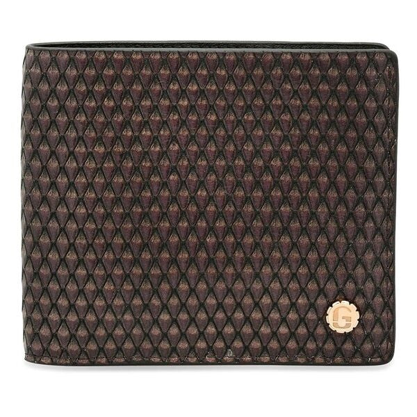WALLET: Genuine hand stitched leather bi fold camel with signature rose gold IP stainless steel G button logo
