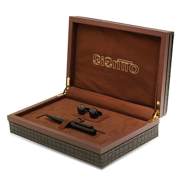 PEN: Stainless Steel polished finish black IP with engraved tube pattern, twist rollerball Schmidt ink. Signature G logo top