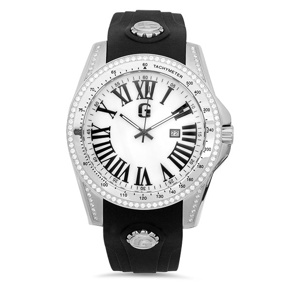 Black silicone strap with signature G logo stainless steel buttons and buckle.