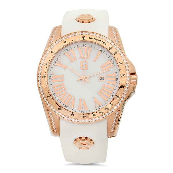 White silicone strap with signature G logo rose gold IP buttons and stainless steel buckle.