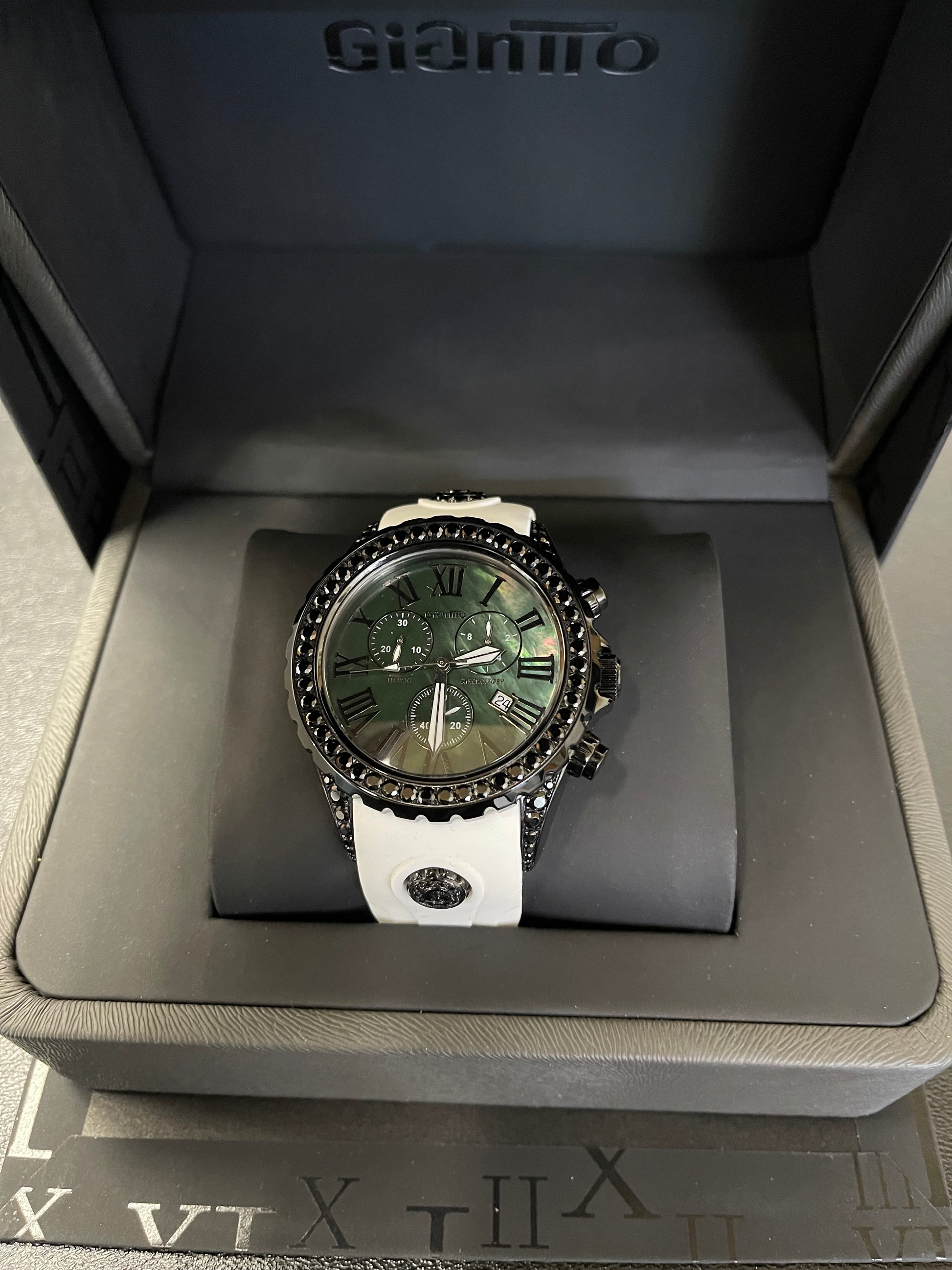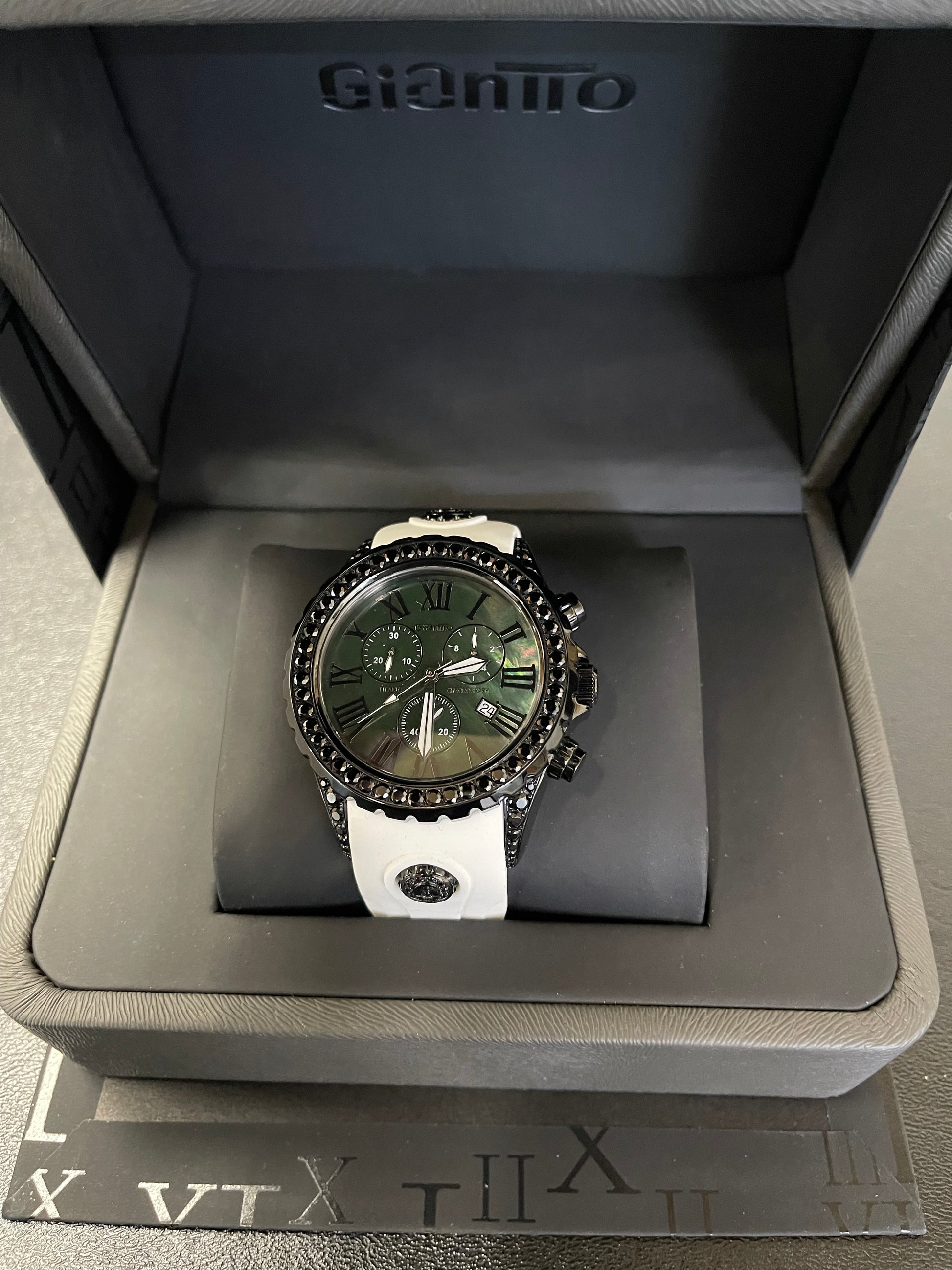Titanic III Black GREEN MOTHER OF PEARL DIAL Swiss ETA quartz Chronograph. Hand set black ONYX bezel and Lugs with WHITE silicone band. 46mm stainless steel case Water resistant up to 5ATM.Ships worldwide from United States