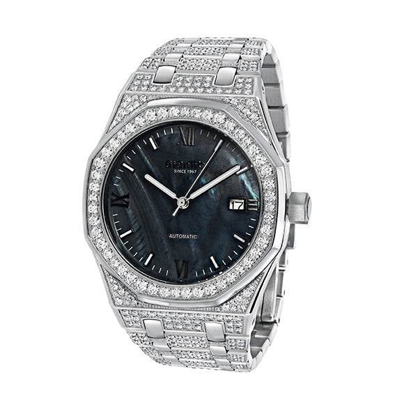 The Giantto G12 full diamond black mother of pearl dial, Automatic Skeleton backMatte polished SS bracelet